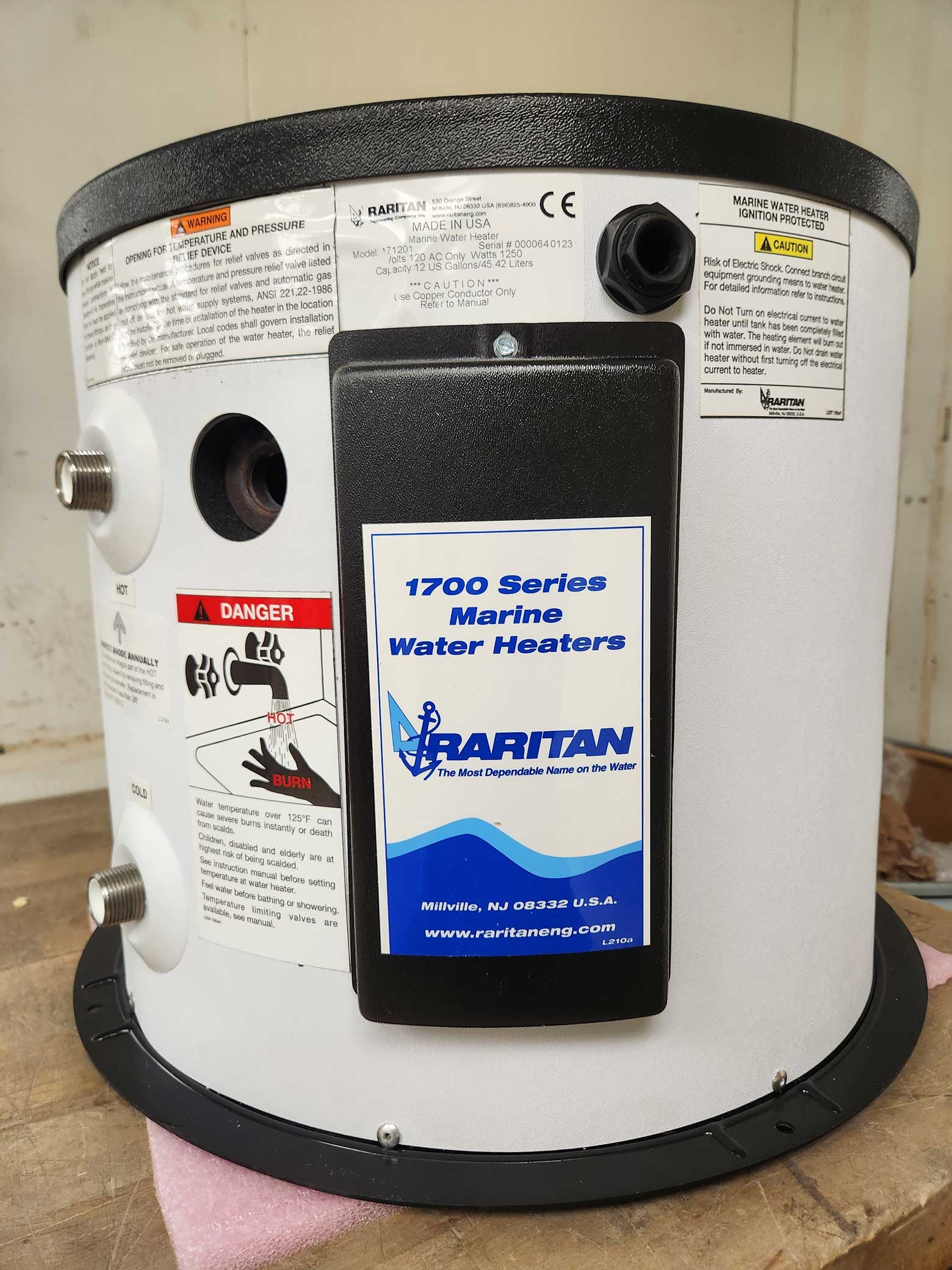 12 gallons/45.42 liters, 120v, 1250 watts, No Heat Exchanger
